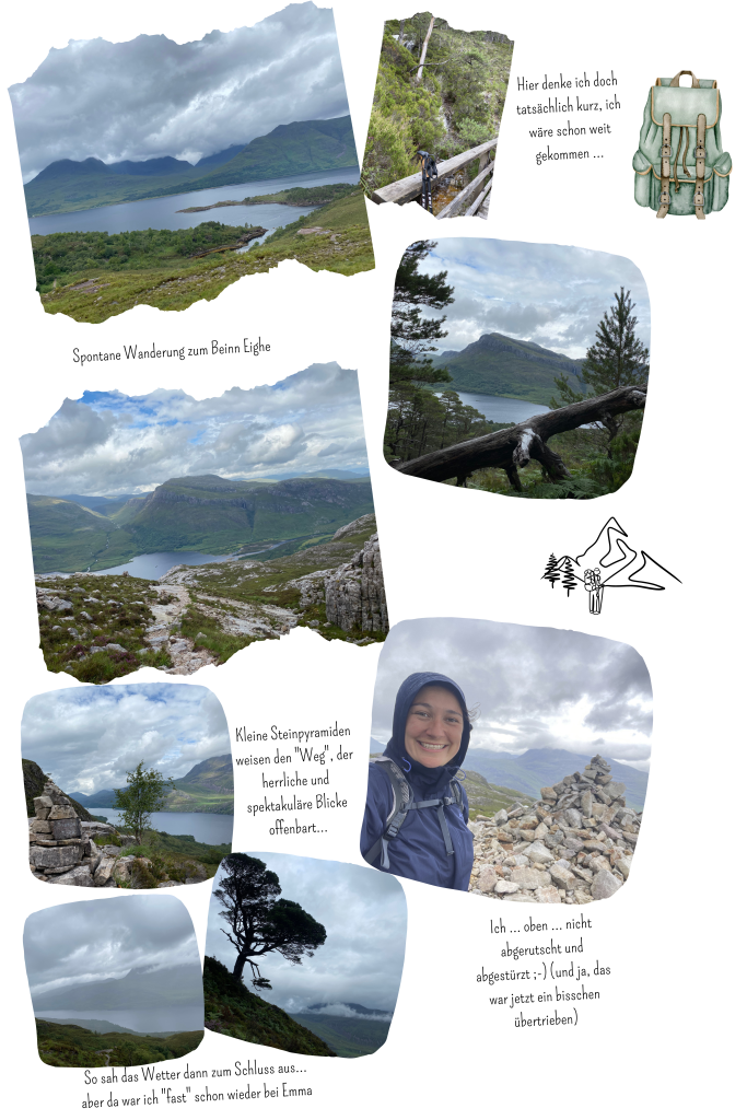 Weil ich mich einer kleineren Wanderung gerechnet hatte (ok, mein Reiseführer sprach von dreieinhalb Stunden, auch nicht gerade kurz), habe ich zwar Wasser, aber wenig Proviant dabei. Weil mir die nette Frau gestern abend aber sagte, das es im Norden Schottlands praktisch keine kleinen süßen Cafes mit leckeren Suppen und selbstgebackenen Kuchen gibt und ich deshalb heute erst in einem kleinen Räucherei-Imbiss und dann noch in einem kleinen Cafe eine Kleinigkeit gegessen hatte (wer weiß, vielleicht ist das ja die letzte Gelegenheit?? 😉 war ich zumindest wirklich nicht hungrig.. und eine Nektarine hatte es sogar in den Rucksack geschafft 🙂 Als es dann noch anfängt mit regnen, verzweifle ich zugegebenermaßen schon ein kleines bisschen, aber zurück ist jetzt eh nicht mehr drin, ich laufe jetzt auf diesen Berg…