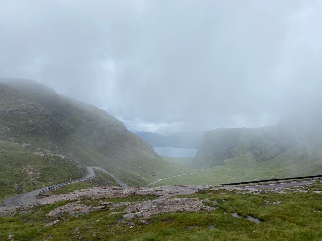 Irgendwann, als die Straße immer kleiner und kurviger und steiler wurde, dämmerte mir aber, dass ich geradewegs auf dem Weg zu einer der spektakulärsten Passstraßen war, die im Reiseführer ganz am Ende der Route kam (und mit der ich daher noch nicht gerechnet hatte), der Reiseführer halt aber auch die gesamte Route in anderer Richtung abgefahren war… clever… Bealach na Ba ist eine wirklich grandiose schmale und sich immer weiter in die Höhe schlängelnde Straße (die sich auch vor den Alpenstraßen nicht verstecken muss), die im Winterhalbjahr grundsätzlich gesperrt ist und auch in der restlichen Zeit einiges für Auto und Fahrer zu bieten hat 😉 es gibt Ausweichstellen, aber selbst die sind recht schmal. Ich habe die interessanten Fahrmanöver vorallem beobachtet, kam aber selbst recht gut und sicher voran, weil ich lieber an einer breiteren Stelle ein bisschen gewartet hab, als mit Emma irgendwelche Experimente zu machen (ich hoffe, sie dankt es mir ;-)) Die Sicht oben wurde dann auch noch recht schlecht inklusive stellenweise dichtem Nebel, so dass es trotz aller Vorsicht spannend blieb und abenteuerlich, aber wir hatten Glück, im Nebel kam zumindest niemand entgegen und irgendwann hatten wir es geschafft und waren ganz heil und auch ein bisschen stolz wieder unten in Applecross angekommen und auch noch direkt am Campingplatz, unserem Tagesziel. Dort sehr nett mit der Nachbarin ins Plaudern gekommen und mir ein paar Tipps für den hohen schottischen Norden geholt – und ein paar Warnungen, was „Horse Flies“ (Bremsen) und Zecken angeht – na das kann ja heiter werden. Ich hoffe, sie ist einfach nur ein bisschen sensibel 😉 (ich kenne mich und meine nicht besonders hohe Schmerztoleranzgrenze aber auch, also mal abwarten… 🙂
