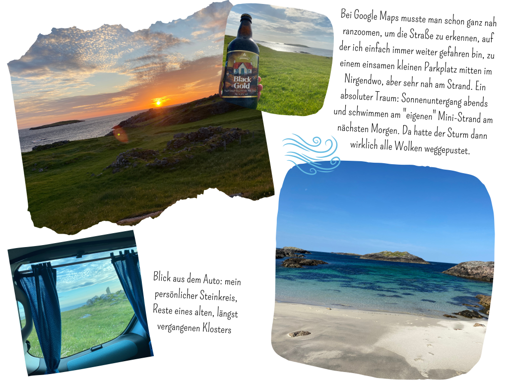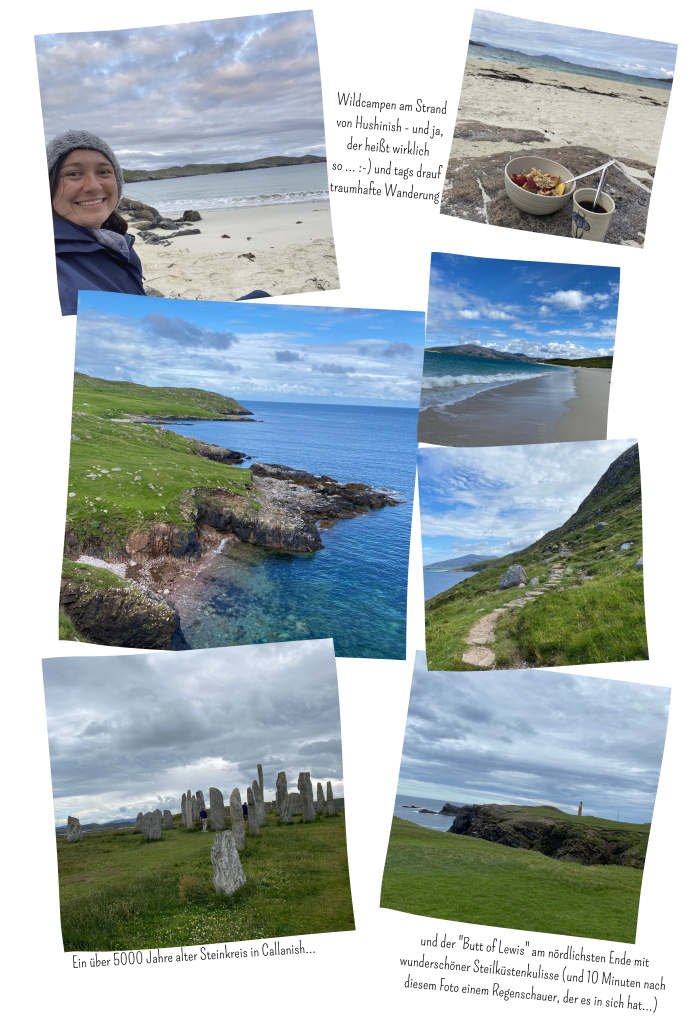 Ich habe hier fast eine ganze Woche verbracht, bin mit Emma bis ganz in den Norden gefahren (zum „Butt of Lewis“), habe den Callanish Steinkreis, der noch älter als Stonehenge sein soll, besucht, Küsten erwandert und am Strand einen filmreifen Sonnenuntergang beobachtet (die Sonne ist richtig ins Meer gefallen). Ich habs einmal ins eiskalte Wasser geschafft (schwimmen würde ich das jetzt nicht nennen, einmal untertauchen und bibbernd wieder raus an den Strand in die Sonne laufen trifft es eher ;-)) und bin vom Wind fast davongepustet worden. Und klar, ich wurde auch wieder einmal komplett in einem Regenschauer gewaschen 🙂 aber wenn die Sonne danach wieder raus kommt, ist das nicht allzu tragisch.