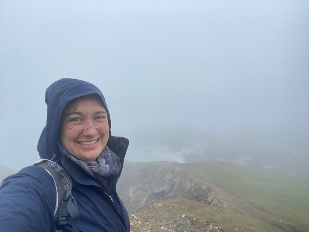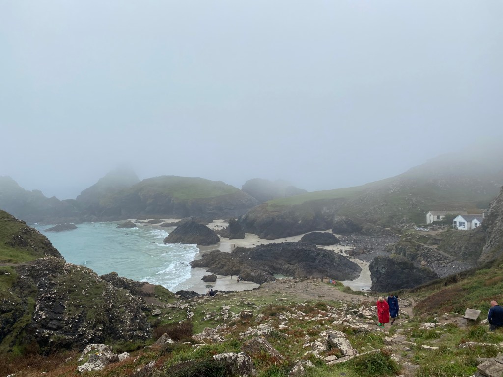 Der kommende Tag ist wirklich wettertechnisch schwierig, aber lange nicht so schlecht wie ursprünglich angesagt. Nachdem ich entspannt gefrühstückt und sogar noch einen Blogartikel verfasst habe (ich hab ja Zeit und verpasse grade eh nix), mache ich mich dann kurz nach Mittag doch mal auf den Weg, im Rucksack eine Flasche Wasser und ein Buch, denn am Lizard Point gab es nette kleine Cafés. Weil der Nieselregen aber eigentlich ganz ok ist und es auch ein paar Kilometer an den Küste entlang noch ein Café gibt, laufe ich einfach ein bisschen den Küstenweg entlang. Und es ist herrlich! Streckenweise (wenn kein Parkplatz in der Nähe ist) bin ich wieder komplett alleine in der Natur, der dichte Nebel und der leichte Nieselregen erzeugen eine wahnsinnig mystische Stimmung, in der man wunderbar einen Fuss vor den anderen setzen und einfach seinen Gedanken und Träumereien freien Lauf lassen kann. Dieses Mal geht es nur selten so auf und ab wie sonst häufig auf dem Küstenwanderweg, sondern lange auch einfach nur auf weiten Wiesen und Weiden mehr oder weniger geradeaus. Es ist absolut wunderbar und erst ein ziemlich heftiger Regenschauer am späteren Nachmittag bringt mich dazu, mal wieder umzudrehen und ein bisschen abseits der Küste, aber immer noch mitten in der Natur zurückzulaufen. Sechs Stunden nach meinem Aufbruch stehe ich dann wieder am Campingplatz – das Buch (und es war kein leichtes Taschenbuch…) habe ich den ganzen Tag mit mir herumgetragen, aber nicht einmal reingeschaut, im Café war ich wirklich nur sehr kurz und habe mich mit einem Cappuccino und einer „Cornish Pasty“ (eine englische Fleischpastete) gestärkt und regenschauernass bin ich natürlich auch (der Schauer hielt sich leider für anderthalb Stunden), aber auch sehr glücklich mit mir und allem drum und dran… einen Küstenspaziergang bei Regen und Nebel kann ich also nur empfehlen 😉