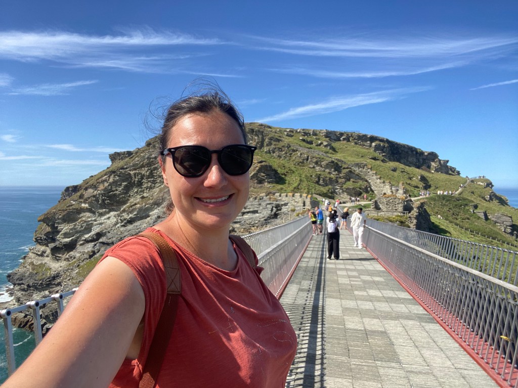 Bevor ich zu meiner kleinen Erkundungstour in Cornwall aufgebrochen war, hatte ich auf Google Maps ein paar Orte markiert, die ein Blog als „die 10 Highlights von Cornwall“ (oder so ähnlich) bezeichnet hatte. Das war mehr Planung, als ich in die ganze Reise von Schottland gesteckt hatte 😉 Diese Markierungen haben tatsächlich ganz gut geholfen und bis auf ein oder zwei „Highlights“ fand ich die Auswahl richtig gut gelungen. Zwei kleine Markierungssterne liegen nun noch zwischen St. Ives und Poole und zum ersten davon fahre ich am nächsten Tag. Tintagel Castle liegt auf einer kleinen Halbinsel an der Westküste Cornwalls und ist sowohl Teil der Artussage, als auch Handlungsspielplatz der Tristan- und Isolde Sage. Vom Castle sind zwar nur noch ein paar Ruinen übrig, aber die Aussicht ist grandios und das Wetter perfekt. Touristen gibt’s auch wieder jede Menge, das verläuft sich allerdings ganz gut, nur auf einer beeindruckenden Brücke, die auf die Halbinsel führt, staut es sich ein bisschen, weil jeder ein paar Fotos machen möchte. Ein bisschen anstrengend ist ein Typ, der wohl noch auf der Suche nach dem perfekten Instagram-Foto ist 😉 der springt irgendwie wild auf der Brücke umher und ist dauernd im Weg 🙂 Amüsant ist das zwar schon, aber auch nicht ganz einfach, ihn nicht auf meinem Foto zu haben… jedes Mal, wenn ich einen Ausschnitt ohne Instagram-Typ gefunden habe und auf den Auslöser drücken will, hat der schon wieder die Position gewechselt und steht irgendwie in „meinem“ Hintergrund herum 😉 Ich bin froh, als ich mein Foto habe und weitergehen kann 🙂