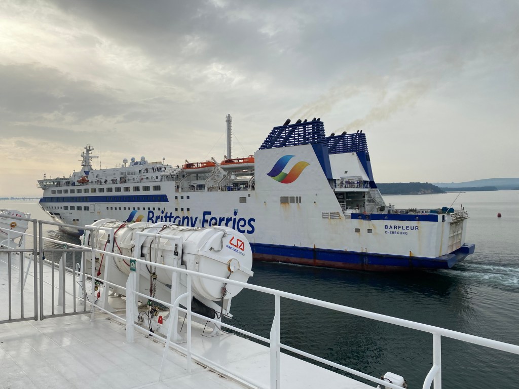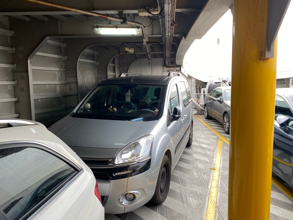 Nach einer nicht besonders erholsamen Nacht im warmen Dachzimmer geht’s dann am nächsten Morgen mit dem Auto den kurzen Weg zur Fähre. Das Prozedere kenne ich ja mittlerweile schon, bin aber doch überrascht, als die Dame am Schalter alle Reisepassinformationen per Telefon an ihre Kollegen durchgeben muss… am Flughafen kennt man das ja, da wird der Reisepass aber nur schnell eingescannt und fertig – hier ist das wohl noch etwas umständlicher. Jedes Wort, jede Nummernfolge muss buchstabiert werden und als sie bei meinem Geburtsort ankommt, muss ich doch lachen… sie tut mir aber auch ein bisschen leid… „Karl-Marx-Stadt jetzt Chemnitz“ muss man auch erstmal auf Englisch buchstabieren 😉 Ansonsten ist das alles hier sehr nett; Emma wird wieder kurz „durchsucht“, also einmal von innen angeschaut, ich entschuldige mich wieder kurz für das Chaos im Auto, unterhalte mich nett mit einem der Grenzpolizisten übers Campen und Reisen und verpasse schon fast das energische Winken des nächsten… und darf dann als fast eine der Ersten auf die Fähre. Kurz freue ich mich, bis ich sehe, welche Ecke man sich für Emma ausgeguckt hat. Als mich der Einweiser herumwinkt und dann meint, „und jetzt einfach rückwärts fahren, das geht ganz schnell“, kriege ich kurz die Krise und er vielleicht auch ein bisschen, weil besonders schnell geht es nicht 😉 Aber irgendwie haben wir es dann, Emma steht in der hintersten Ecke der Fähre, ich bin jetzt richtig wach und mache mich auf den Weg aufs Deck … fünf Stunden Überfahrt nach Cherbourgh in der Normandie warten auf uns.