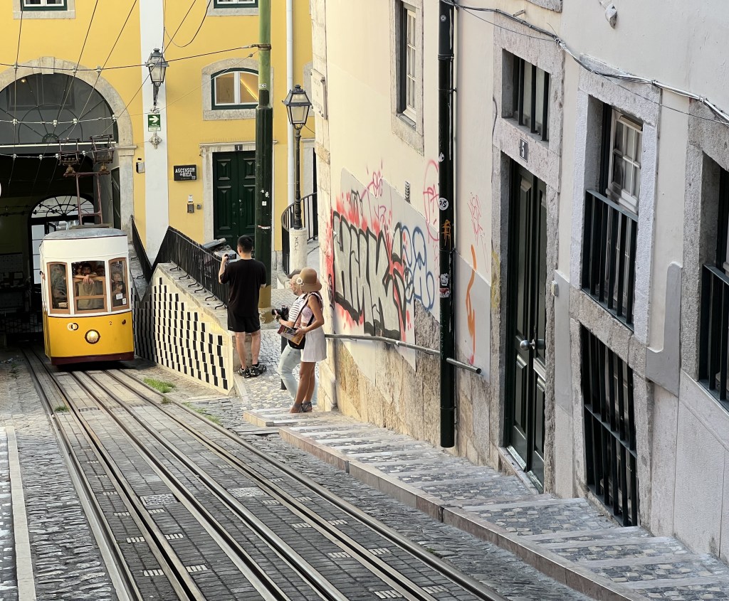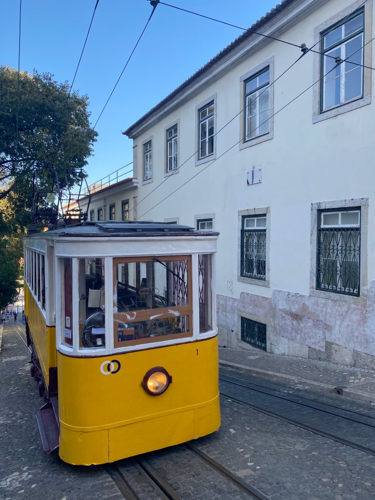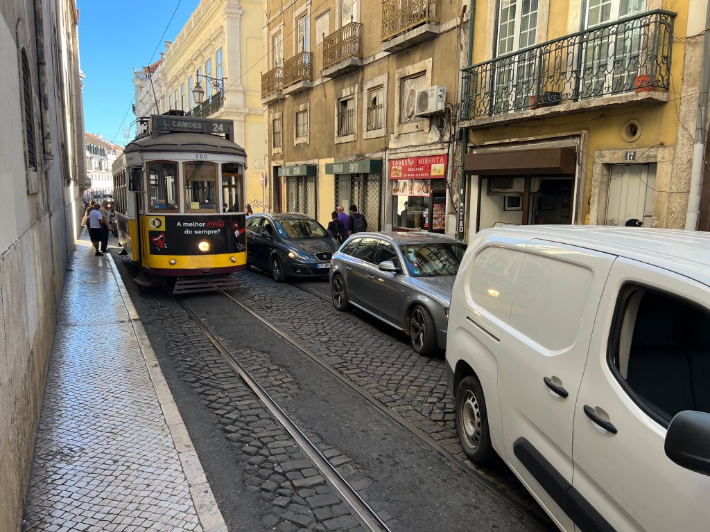 In Lissabon übernachten wir in einem kleinen Appartment mitten in der Altstadt – und dummerweise wirklich MITTENDRIN… schon der Taxifahrer wirkt leicht verzweifelt, als er unsere Adresse sieht – er weiß zumindest, was gleich auf ihn zukommt, wir sind da noch völlig ahnungslos. Ich sage es mal so: wer mal direkt an einer der steilsten Straßen in Lissabon übernachten möchte, mit einer dieser alten berühmten Standseilbahnen (Ascensores de Lisboa), die sich ab morgens um sieben quietschend den Berg hochschiebt (und wieder runter) und abends an einer der Straßen, in denen jeder Hauseingang sich zur Bar verwandelt, der kann gerne Bescheid sagen, ich weiß genau, welches Airbnb da geeignet wäre 😉 Wer aber gerne irgendwann nachts auch mal schlafen möchte (und das am liebsten in Ruhe macht), dem würde ich unser Appartment vielleicht nicht direkt ans Herz legen… denn ja, morgens um sieben quietscht die Straßenbahn direkt am Haus vorbei, kurz danach kommt das Müllauto und abends ist Party angesagt, bis morgens um vier kann man den lauten Gesprächen zuhören. Also mittendrin statt nur dabei 😉 Und noch ein kleiner Fun Fact: vor den bodentiefen Fenstern sind so kleine Balkone und man muss sich nicht besonders strecken, um an die dicken Stromkabel der Standseilbahn zu kommen…