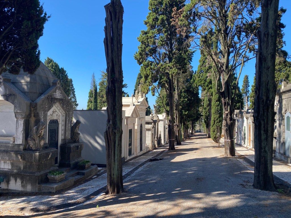 Am ersten Morgen in Lissabon machen wir uns erstmal auf den Weg zur Endhaltestelle der Straßenbahnlinie 28E, die zum Stadtbild von Lissabon gehört und praktisch alle wichtigen Sehenswürdigkeiten anfährt. An der Endhaltestelle einzusteigen ist ein kleiner Geheimtipp (den leider sehr viel kennen), aber wir ergattern tatsächlich noch zwei Sitzplätze und das grenzt in dieser immer übervollen Bahn dann schon an ein mittelgroßes Wunder. Zuvor spazieren wir noch kurz über den großen Friedhof Cemiterio dos Prazeres. Schon in Südamerika fand ich die Atmosphäre auf diesen Friedhöfen mit ihren an Häuserzeilen erinnernde Grabmäler sehr einzigartig und faszinierend und hier in Lissabon bietet sich uns sehr überraschend auch noch am Ende der großen Allee ein fantastischer Blick über den Rio Tejo und die portugisische „Golden Gate Bridge“ (sieht wirklich so aus und hatte auch denselben Architekten) sowie eine Christusstatue am anderen Flussufer.