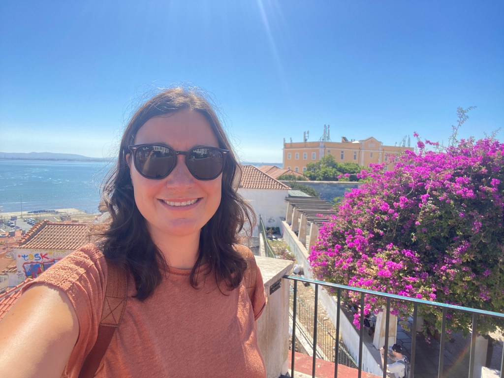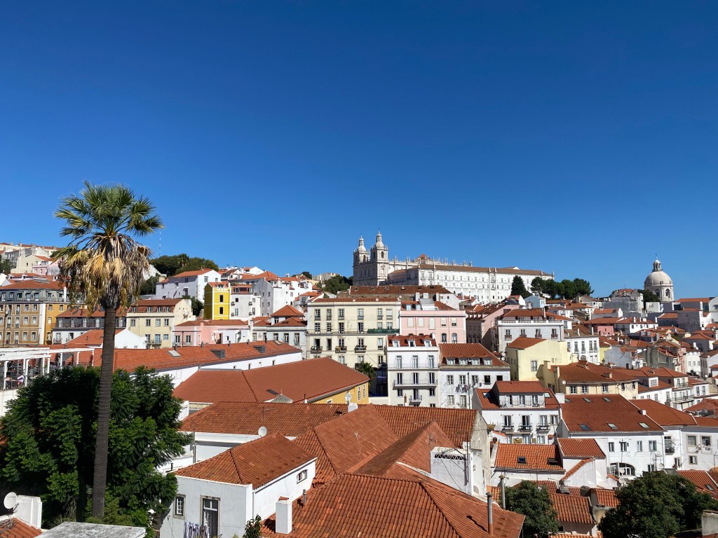 Und dann sitzen wir endlich in der Straßenbahn und tuckern durch die Altstadtgebiete von Lissabon. An jeder Haltestelle drängen sich mehr Leute in die Bahn (die doch am Anfang schon mehr als voll war), nicht nur Touristen, sondern auch Einheimische mit ihren Einkäufen in der Hand… Als wir dann irgendwann nach einer knappen Stunde, zwar noch nicht ganz an der anderen Endhaltestelle angekommen einfach nur noch im Stau stehen, ergreifen wir quasi die Flucht und landen auf einem der schönsten Aussichtspunkte von Lissabon, dem Miradouro Portas do Sol. Immer noch sind viele Menschen um uns herum, aber die Aussicht ist herrlich!