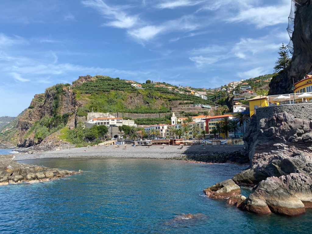 An unserem ersten Tag folgen wir der Straße immer an der Küste entlang, halten kurz im Städtchen Ponta Do Sol mit seiner bunten Häuserzeile am Meer und dem typischen Steinstrand, fahren dann weiter bis ganz in den Westen zum Leuchtturm und dann gehts auf dem einzigen noch nicht neu gebauten Stück Straße ganz schön schlängelig nach Norden zum bekannten Städtchen Porto Moniz. Ganz ehrlich: bin ich froh, als wir dort ankommen, denn trotz vorne sitzen, ist mir dann doch zum Schluss ein bisschen schummrig in der Magengegend…