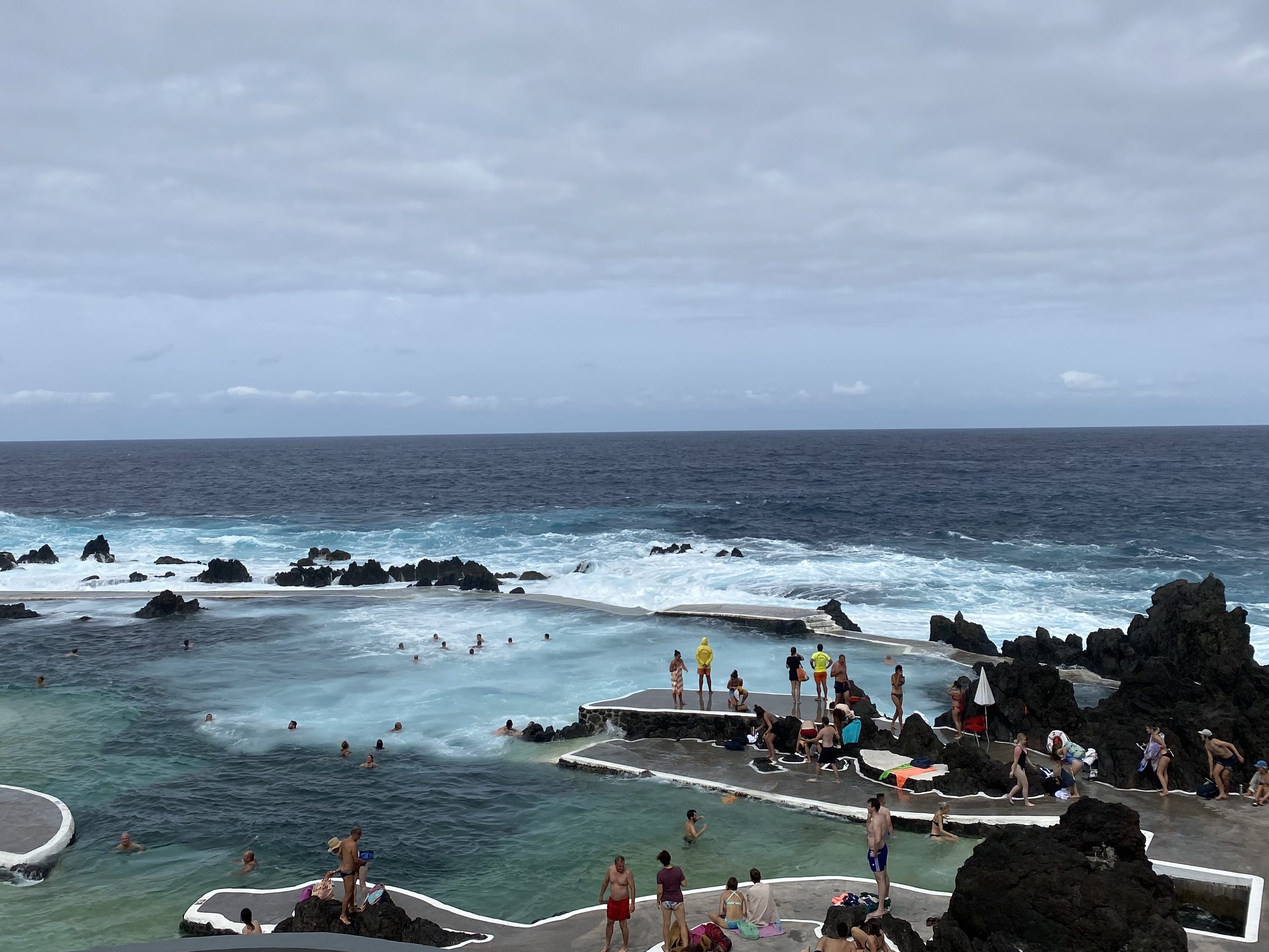 Porto Moniz ist für seine beiden Atlantikbäder bekannt, eins gratis und eins eher als Freibad mit etwas Eintritt. Vor hohen Wellen ist man übrigens auch in größeren Bad nicht gefreit: weil es heute hier tatsächlich kurz bedeckt ist, sind wir nur gucken und beobachten und das Bild hier unten ist direkt entstanden, nachdem eine ziemlich große Welle das komplette Becken einmal so zum überschwappen gebracht hat, das auch ne ganze Menge Menschen außerhalb des Wassers und ihre Taschen ziemlich nass geworden sind…