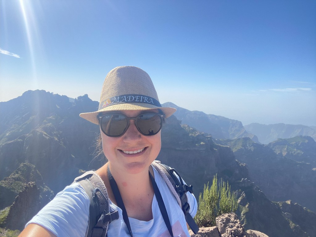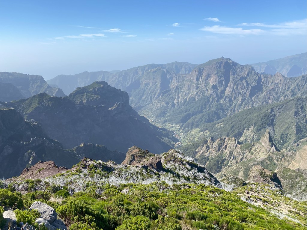 Am vorletzten Tag bequatsche ich meinen Vater noch zu einer „Bergbesteigung“ – wir wollen (also ich will 😉 ) auf den höchsten Berg der Insel, den Pico Ruivo (1.861 m). Erstmal fahren wir eine gefühlte Ewigkeit im Auto Serpentinenstraßen … immer im Blick die Resttankanzeige 😉 die war morgens noch bei guten 200 km und nähert sich nun in großen Schritten (und nach nur 50 gefahrenen Kilometern) der 0 … hätten wir vielleicht doch mal direkt getankt… ? Aber wir schaffen es noch auf den riesigen Parkplatz und starten zwar nicht besonders früh, aber noch geradeso (hitzetechnisch) früh genug. Es sind tatsächlich mal angenehme 25 Grad hier oben. Der Weg ist angenehm zu laufen, gepflastert und mit schönem Blick, aber doch irgendwie länger als angenommen… irgendwann wirds dann auch steiler und voller (wir haben uns für den kürzesten Weg entschieden, zwei andere längere Wege biegen aber irgendwann auf unseren mit ein). Bis wir oben ankommen, verfluche ich mich schon von Zeit zu Zeit … warum ich unbedingt trotz Erkältung auf diesen Berg steigen wollte … aber der Blick entschädigt!!!