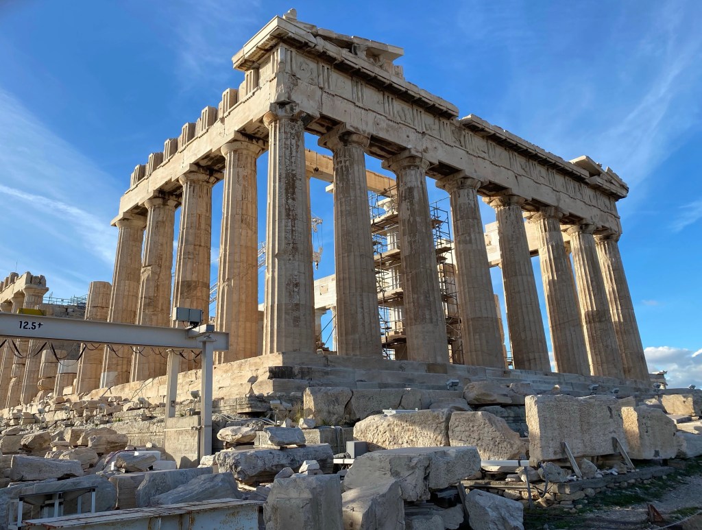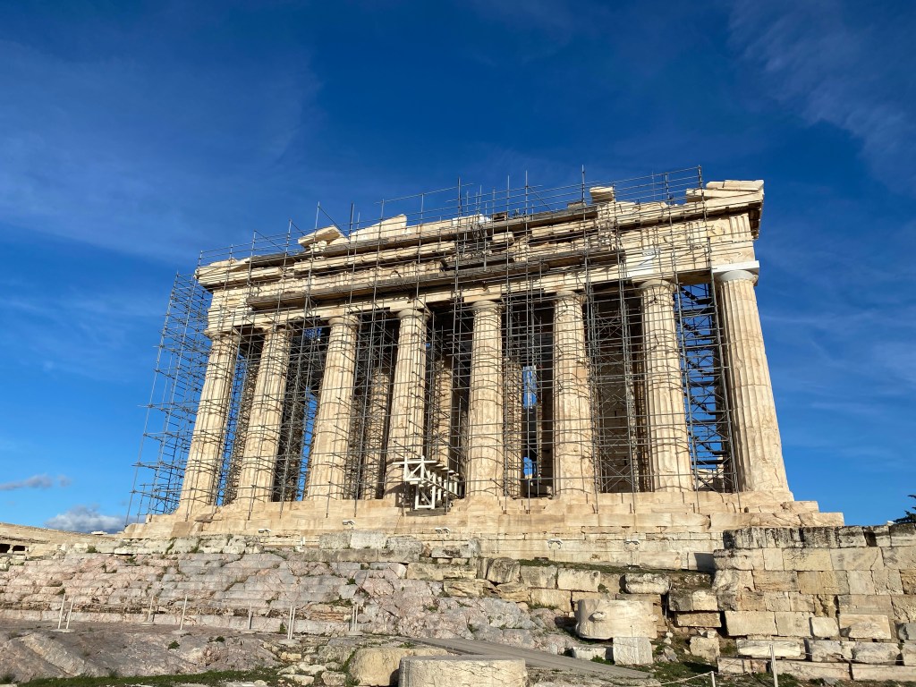 … und dann steht man endlich oben und sieht als Erstes … jede Menge Baugerüste 😉 na gut, und auch den berühmten Parthenonas, den bekanntesten Tempel hier oben, bzw. den Tempel, den zumindest ich immer vor Augen habe, wenn ich „Akropolis“ höre: