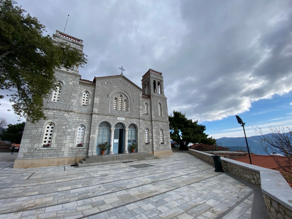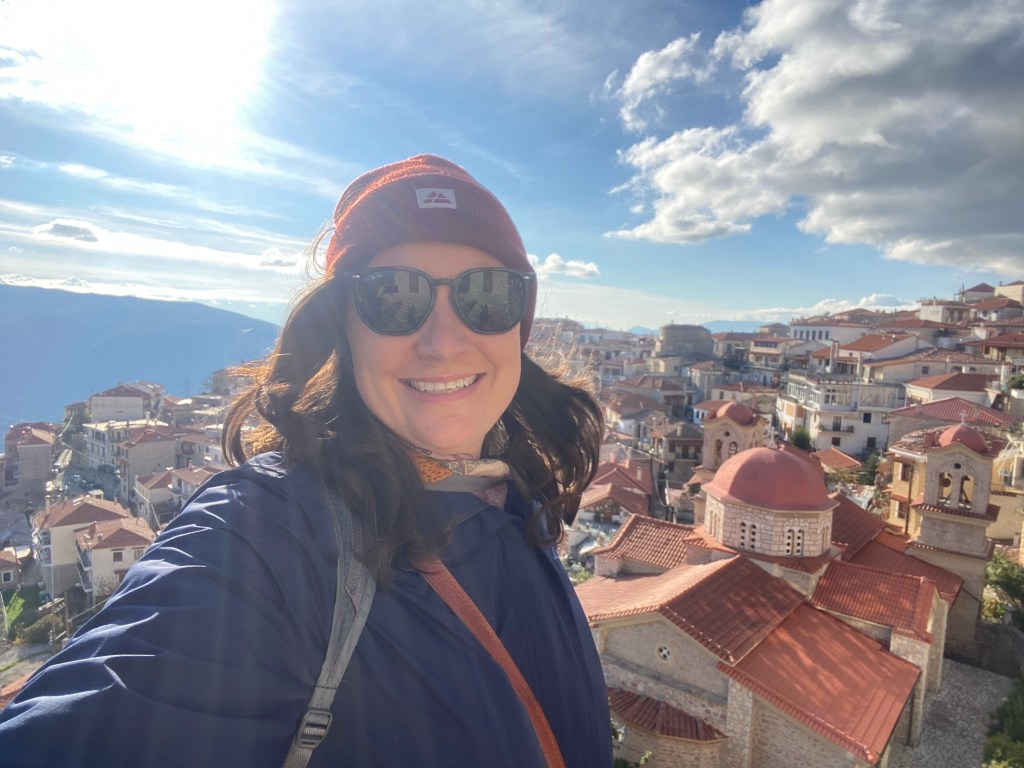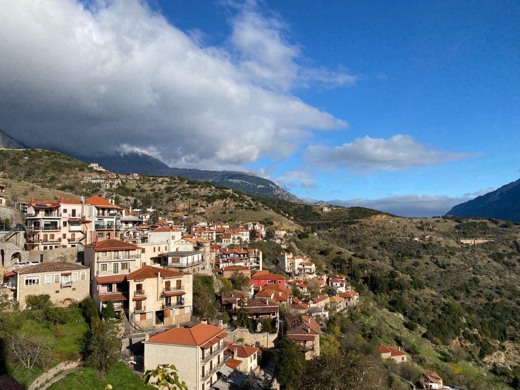Und dann steigen wir schon wieder in unseren Bus und fahren ein Stückchen Richtung Athen, aber nur ein Stückchen, denn auf dem Weg liegt gleich noch das kleine Städtchen Arachova. Das liegt total malerisch am Hang, immer noch mit traumhaften Blick auf dieses Olivenbaum-Tal. Anscheinend ist das hier ein richtiger Wintertourismus Hotspot für das Who-Is-Who von Athen und wenn man mal von dem an sich schon griechischen Style des Dörfchens absieht, könnten die unzähligen Boutiquen und Souvenirläden auch in der Schweiz liegen. Preislich übrigens auch, zumindest manchmal … Davon abgesehen ist es aber wirklich malerisch und da wir uns auch grade noch kurz vor der Hochsaison befinden, ist es nicht so überlaufen wie anscheinend im Winter zur Skisaison.