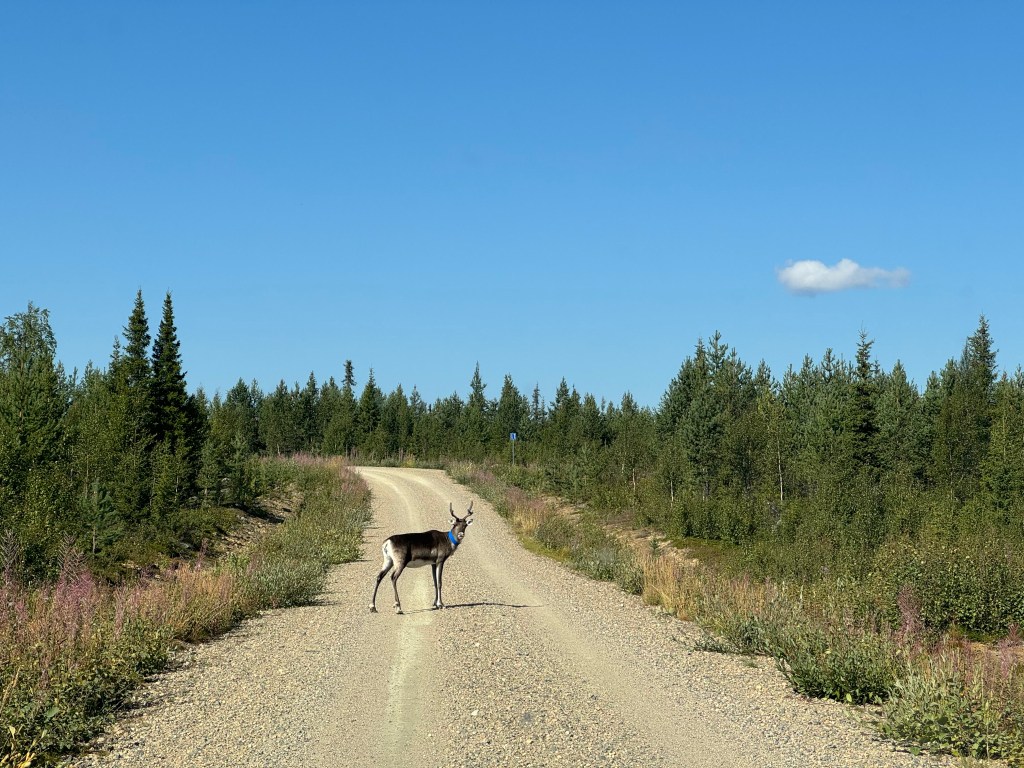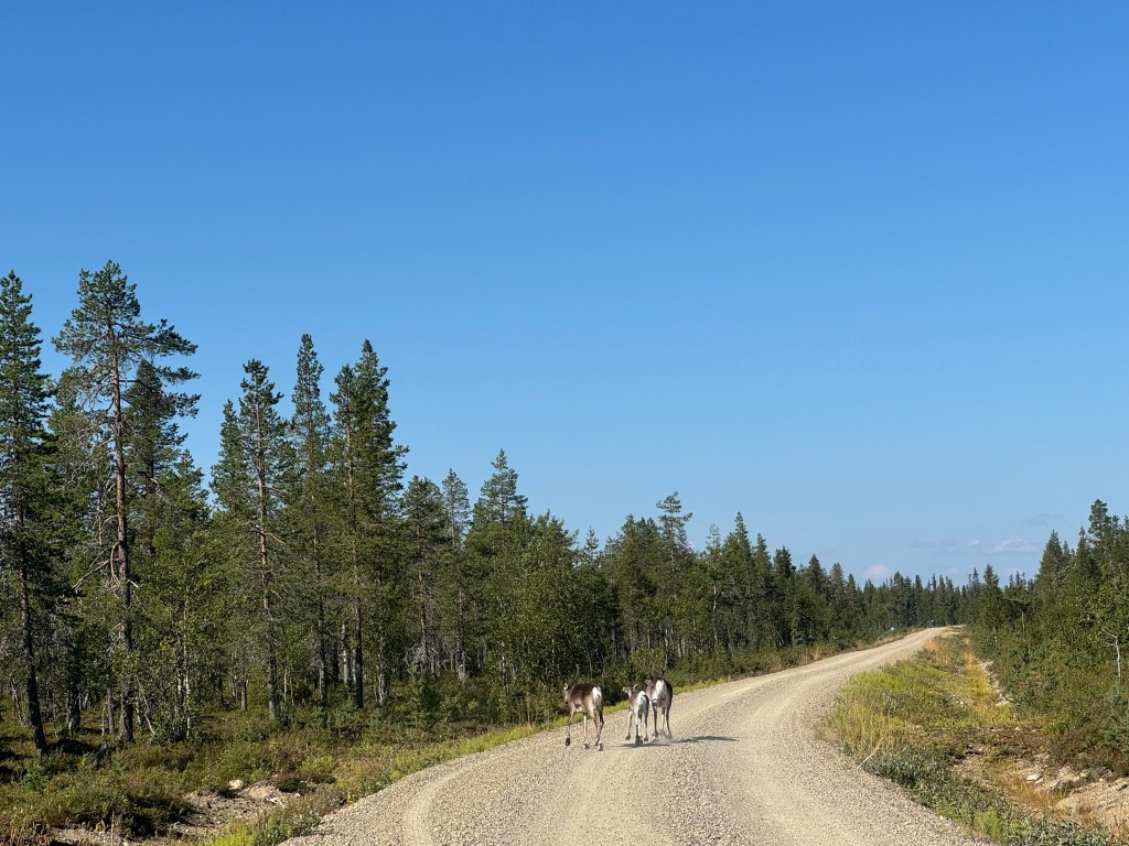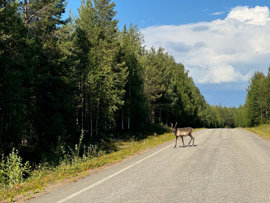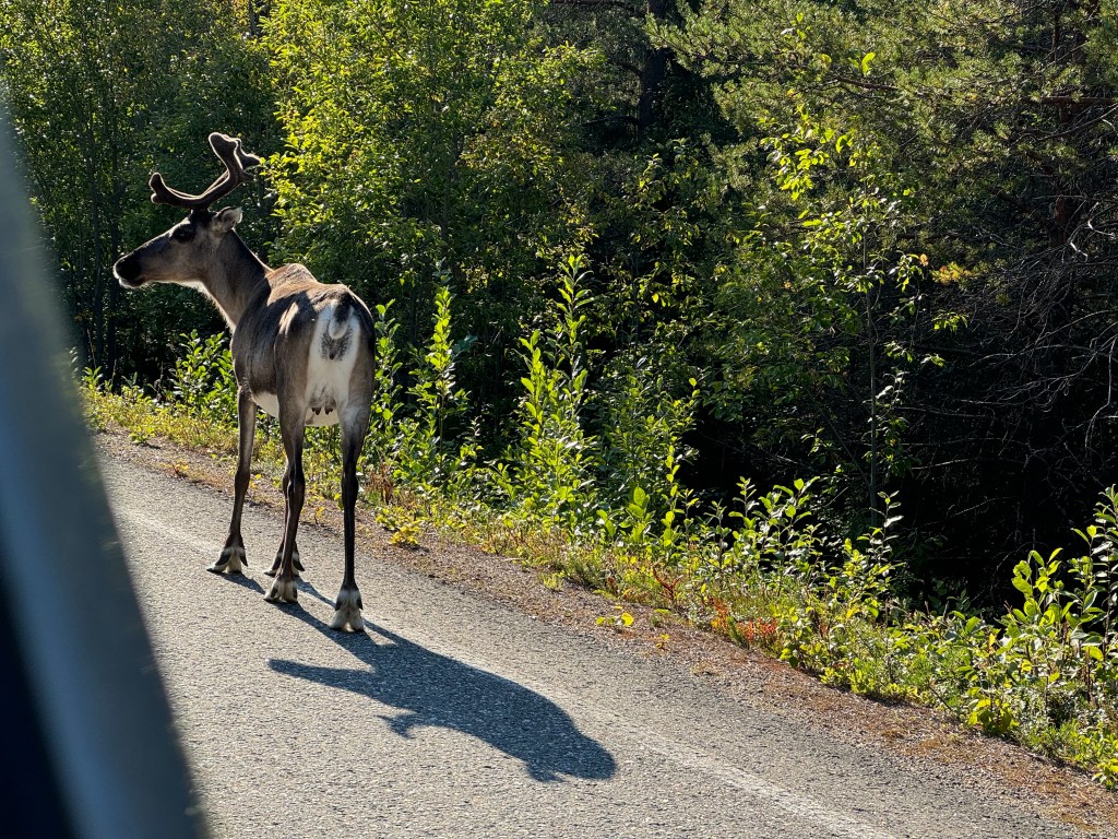 Mit einer Rentier“familie“ habe ich richtig viel Spaß: „Mama“ und „Kind“ traben ewig vor mir her … fahre ich langsam auf sie zu, laufen sie aufgeregt vor mir weg … aber nicht etwa die Böschung runter und in den schützenden Wald … nein!! … immer schön mittig auf der Straße. Bleibe ich stehen (ich will sie ja auch nicht verschrecken), bleiben sie auch sofort stehen und schauen neugierig her… und so geht das vielleicht eine Viertelstunde lang. Zwischendurch gesellt sich noch „Papa“ Rentier dazu, siehe Foto, aber dem wird das nach kurzer Zeit zu blöd und er springt wieder runter in den Wald… Es ist ein köstliches Schauspiel und davon abgesehen, das ich längere Zeit nicht weiter-, weil nicht dran vorbeikomme, ist es einfach nur sehr, sehr herrlich!!!