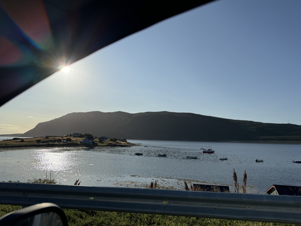 Weil der kostenlose Wanderparkplatz, von dem aus dieser Wanderweg startet, dafür bekannt ist, schnell sehr gut gefüllt zu sein und die Wanderung sowieso mit 18 Kilometern eher länger ist, will ich möglichst früh dort ankommen – daher der frühe Start aus Olderfjord. Die Fahrt morgens zwischen sieben und acht gehört aber erstmal mit zu den herrlichsten, die ich je gemacht habe. Zum einen ist diese Küstenstraße, die sich immer weiter nördlich windet, einfach atemberaubend schön. Dann diese Sonne und außerdem scheint noch kein Mensch so früh unterwegs zu sein! Ich habe die Straße wirklich fast ausschließlich ganz für mich alleine. Das ist so irre … hier, wo ich mich ein bisschen vor den Touristenmassen gefürchtet habe, bin ich ganz alleine und darf bei herrlichsten Sonnenschein zwischen der Küste mit den vereinzelt verschlafen daliegenden Holzhäuschen und den schroffen Felsen herumkurven.