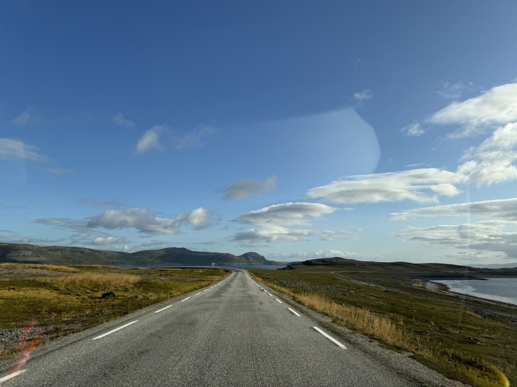 Voller Vorfreude und mit Blick in den strahlend blauen Himmel hatte ich heute morgen erstmal eine kurze Hose angezogen, war dann aber beim ersten Foto-Zwischenstop kurz erfroren (13 Grad und Wind!) und hatte dann doch nochmal auf lange Kleidung gewechselt. Zum Nordkap breche ich dann richtig warm angezogen auf: inklusive Mütze und Schal 😉