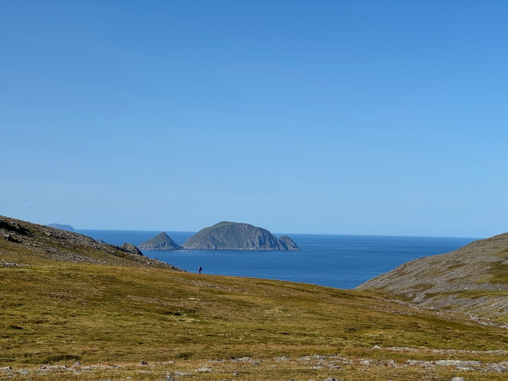 Irgendwann taucht in der Ferne zu rechter Hand ein riesiges Felsplateau auf mit weißer Kuppel und ich weiß, dort ist das offizielle Nordkap, da werde ich heute Abend noch sein. Aber fürs erste folge ich diesem steinigen Pfad hier, der lange eher geradeaus führt, irgendwann an einem kleinen See vorbei und dann einen Hang hinunter, den das letzte Drittel führt ziemlich auf Küstennivau an einer Landzunge entlang. Wie ich so diesen Hang hinunter schaue und mir nichts dabei denke, kommt ein älteres Paar, schon auf dem Rückweg, gerade oben an und mir wird klar, dass dieser Hang auf dem Rückweg recht anstrengend werden könnte.