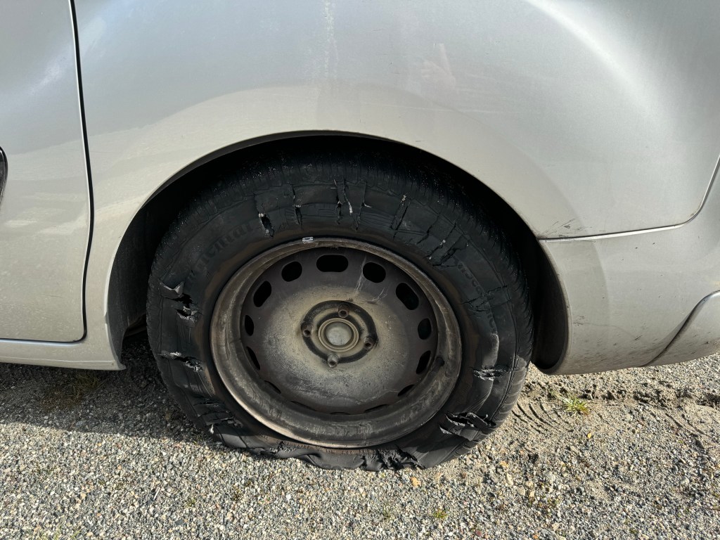 Habe mir das immer (so albtraummäßig) vorgestellt, das es einen lauten Knall gibt, das Auto hin und her schlingert und man leicht die Kontrolle über das Auto verliert … Albtraum halt. In Realität ist es (und dafür bin ich sehr dankbar), äußert unspektakulär. Mit einem Mal werden die Fahrgeräusche extrem laut, so als würde man über ganz viele Bodenschwellen fahren und als ich die Straße und den Wind (warum auch immer) als Übeltäter ausgeschlossen habe, gucke ich mir dann doch mal Emma an… und tatsächlich, der Reifen ist hin.
