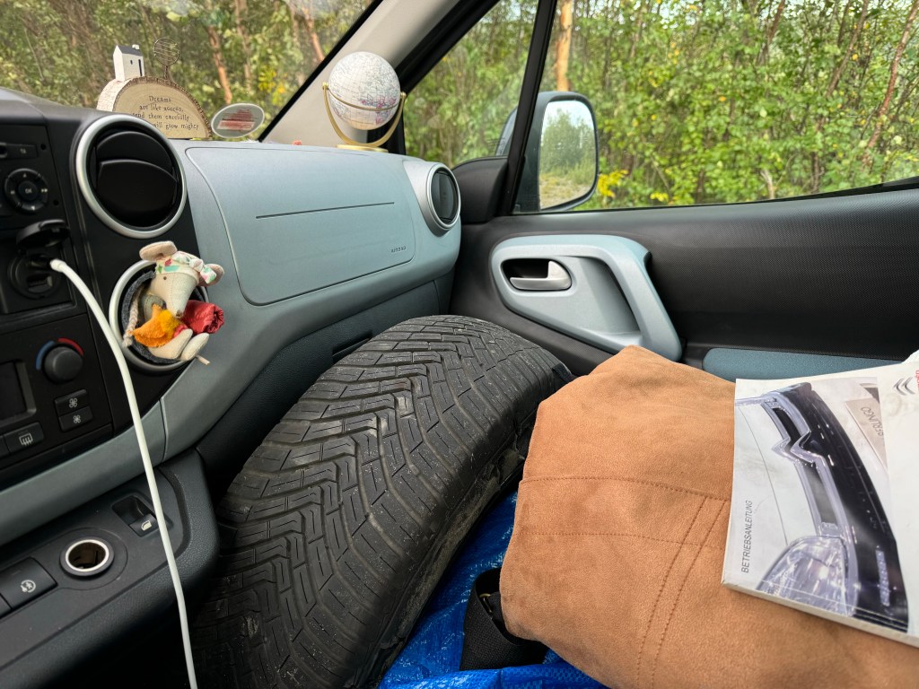 Weil Emma tatsächlich einen Ersatzreifen hat (was mir anfangs gar nicht so klar ist, ein Anruf beim Familien-Autoexperten da aber hilft 🙂 ), geht dann alles relativ schnell. Emma ist wieder fahrbereit und ich habe jetzt noch einen „Mitbewohner“ vor dem Beifahrersitz …