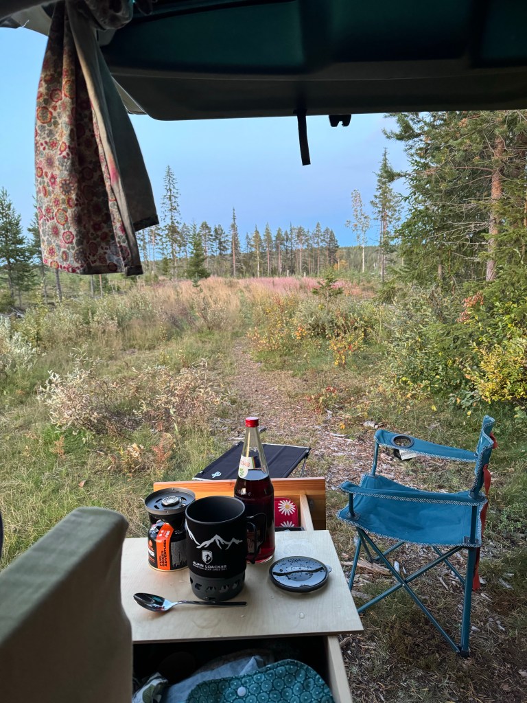 Als ich noch circa 200 Kilometer von Kiruna entfernt bin, finde ich ein kleines Plätzchen am Straßenrand, aber hier ist eh nix los und richte mich mal wieder häuslich ein.