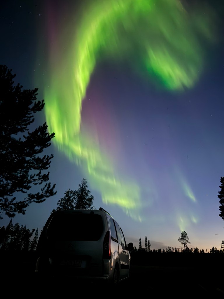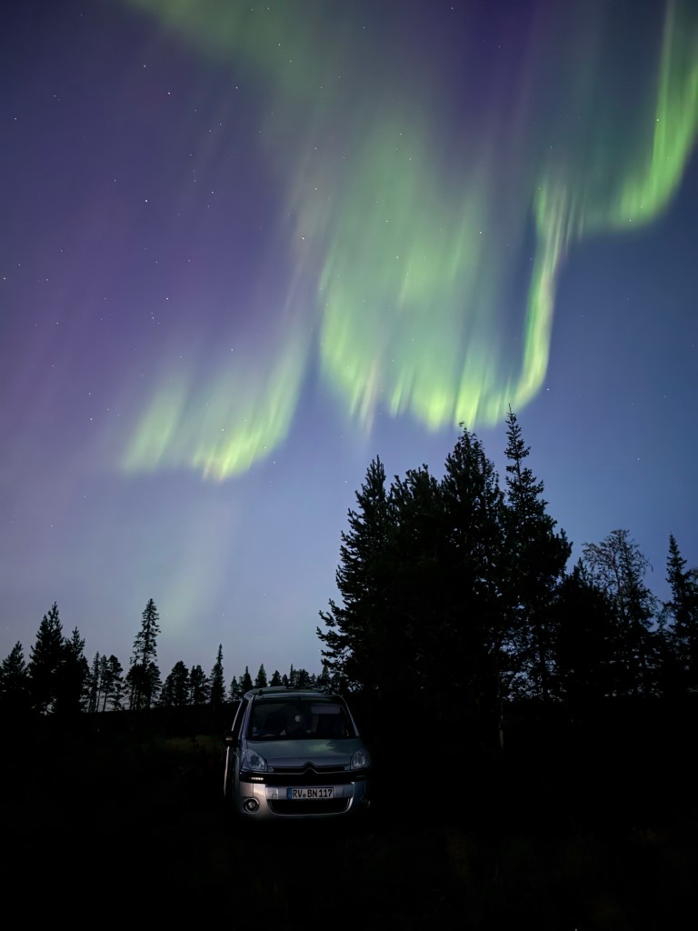 Ich krieche also erstmal in Schlafsachen und ins Auto und gucke einfach immer mal aus dem Seitenfenster. Nichts, auch eine Stunde später nichts. Na dann eben nicht. Aber einmal verrenke ich mir noch den Kopf und gucke nach oben, bevor ich die Augen zu mache… und bin völlig sprachlos: denn da tanzen über mir die allerschönsten, mit dem bloßen Auge erkennbaren, grünen Lichtschleier der Aurora Borealis. Magisch. Wunderschön.