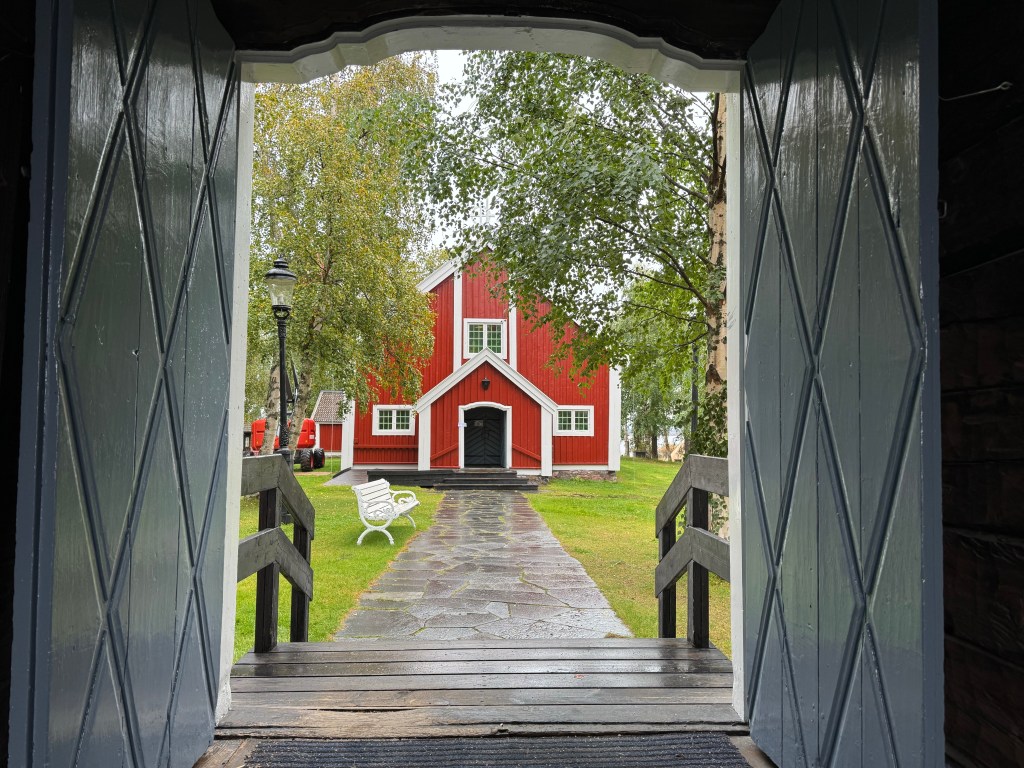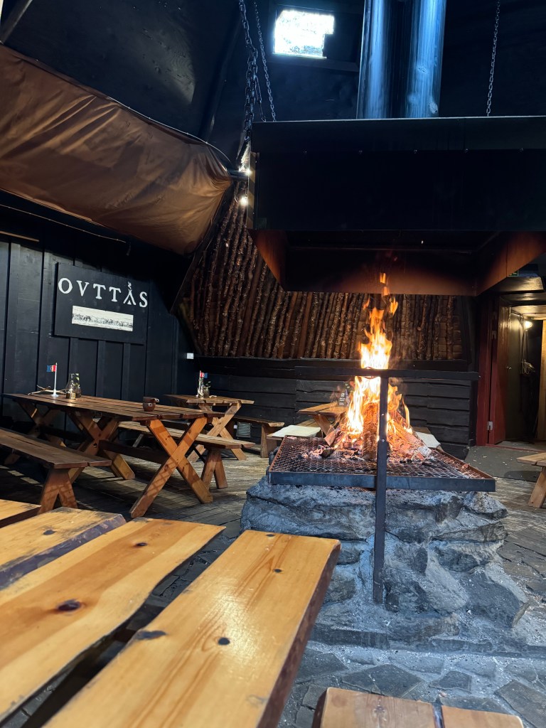 Nicht weit von meinem kleinen Parkplatz entfernt ist auch ein kleines Dörfchen mit sehr alter und hübscher Kirche und kleinem Museum. Ins Museum gehe ich zwar nicht (das dritte Samen-Museum in zwei Wochen ist leider ein bisschen viel), aber ich esse einen sehr leckeren (sorry!) Rentier-Burger in einem wundervollen kleinen Restaurant, in einer Art Riesen-Zelt mit prasselndem Holzfeuer in der Mitte.