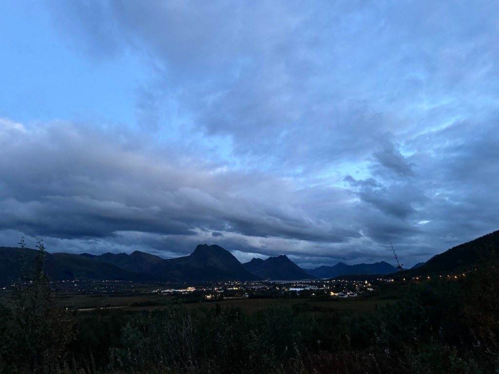 Eigentlich will ich unterwegs noch irgendwo Halt machen, aber die Westküste Norwegens zieht mich einfach immer weiter an 😉 (und der Regen macht Pausen jetzt auch nicht so verlockend…) kurz nach acht, die Sonne ist grade untergegangen, komme ich auf einem kleinen und verlassenen Wanderparkplatz ganz im Westen der Lofoten, 400 Kilometer und sechs Fahrstunden entfernt von Kiruna an. Da habe ich heute ganz gut Strecke gemacht 😉 Und gucke zum ersten Mal seit Tagen sehr nervös auf die Wettervorhersage der kommenden Tage und bin total erleichtert, dass es zumindest morgen und übermorgen gut aussieht… Ich bin unglaublich froh, jetzt hier zu sein und auf dem Handydisplay für morgen sogar ein heiteres Sonnensymbol zu sehen … und ich hoffe, dass Emma und ich jetzt halbwegs heile weiterkommen …